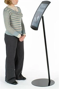 This metal, magnetic frame is a great sign holder for displaying sales promotions. The unique design of this sign stand will cause passersby to stop and take notice. This magnetic frame can be used to welcome clients into your store or restaurant. The relatively small footprint of this fixture doesn’t consume much floor space. You can even find this curved sign, magnetic frame in a restaurant entry way, showcasing the menu or the “special of the day.” Retail stores and business offices alike, use this sign stand to keep visitors and patrons informed. This magnetic frame, also known as a sign holder, stands almost 5-feet tall; a great eye-level height ensuring it will be noticed. This sign post ships unassembled, thereby saving on shipping costs.