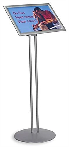 This lobby stand, also known as a sign holder, offers maximum flexibility and versatility. This poster display features height and tilt adjustability. Designed to hold 11″ x 17″ signs and menus, this lobby stand is great for a wide variety of locations. Position this sign pedestal in a busy entranceway or vestibule to greet visitors. Each lobby stand features a double metal pole stand, matching base, and a snap open sign frame. A silver brushed aluminum finish adds style to your display, while flip open edges allow for fast graphic changes. We provide this lobby stand with an acrylic lens to protect your signs and reduce glare. Sign change outs are easy with the snap frame design.