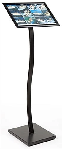 These 11″ x 17″ freestanding sign holders are made to display menus in a restaurant, information in a lobby, “Line Starts Here” sign in an upscale venue, and more. Floor standing poster frames with the wave pole are stylish and will stand out in any environment. These freestanding sign holders, called pedestal print stands, can display an image in portrait or landscape format. Please refer to the images and steps below for information on how to rotate the frame. Switching these freestanding sign holders from vertical to horizontal format is an easy task which can be done by (1) person using a Philips head screwdriver. This floor standing advertisement display comes equipped with an anti-glare lens to guard the images from dust, fingerprints, tearing, or creasing. These freestanding sign holders will keep the graphics looking sharper longer. Each poster frame is single-sided and made for indoor use only. These freestanding sign holders snap open to allow for fast and easy updates. Simply clip open each of the (4) sides of the frame, lift the plastic sheet and place graphics inside and replace the clear lens and snap shut all the sides of the frame to make for a secure fit. These print stands are freestanding sign holders that have rubber feet to prevent the floor from becoming scratched or nicked. Each poster display has a black matte finish that will coordinate with any décor.