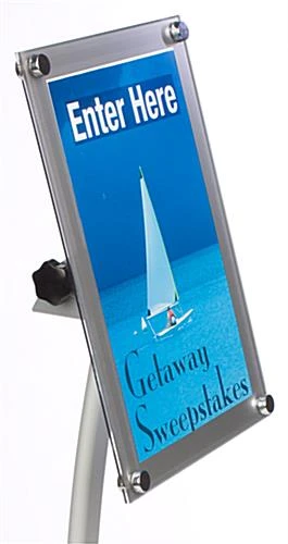 Lobby stands, graphic holders, and other sign displays can hold an 11″ x 17″ graphic in between (2) acrylic frames. These acrylic frames are held together with (4) screws that have decorative endcaps. Sign displays make changing out graphics easy, as you simply have to remove the top (2) caps, insert your graphic, and replace the endcaps. The acrylic frames also have a silver border that makes the graphic really stand out. These menu holders, sign displays can be mounted either vertically or horizontally onto the stand. To change the orientation, the frame is removed from the bracket and repositioned. Lobby stands are perfect sign displays for use in hotel or business lobbies, restaurants, or even retail stores. Use these poster stands to promote a new product, or to greet incoming guests.