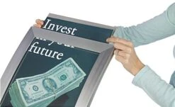 This poster holder, metal sign frame is crafted from anodized aluminum with a satin silver finish. The framing features a channel to slide in your poster or graphics. This metal sign frame comes complete with a sturdy backer and non-glare plastic lens to ensure your message is clearly viewable from all angles. To start displaying your message, simply slide out the backer and lens, sandwich your poster between, and then slide back into frame channel. A half-elliptical base adds even more style, as well as stability, to your metal sign frame. This base also features rubber feet to ensure the metal frame remains stable on almost any surface. This metal sign frame ships unassembled to save on shipping costs. The metal poster frame display comes complete with all necessary hardware and assembly instructions for quick, simple 1-person set up.