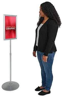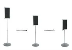 These satin silver poster holders, sign frames feature a 14″ diameter pedestal style base. A single upright pole telescopes, so the top of the framing can extend anywhere between 45-1/2″ to 69″ high. The 11″ x 17″ sign frame displays menus, advertisements or other images on both sides of the holder. A 1/4″ thick black expanded PVC backer ensures your images stand upright without sagging, while non-glare plastic lenses ensure the message in your sign frames is visible from all angles. This backer could also be brought to your local sign shop to be silk-screened with vinyl lettering, to create a more permanent message. To insert graphics into your sign frames, simply pull out the backer and two lenses, sandwich each of your posters between the backer and a non-glare lens, and slide into the framing. Change out graphics in just seconds with these sign frames! These poster displays ship unassembled. These sign frames can be put together by one person in just a matter of minutes.