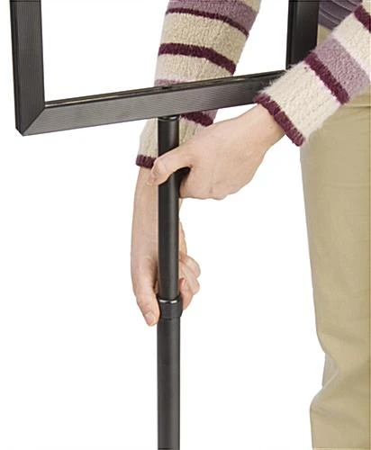 Poster holders, sign frames feature a telescoping, 1″ diameter pole, set atop a 14″ diameter base, holding a 12″ wide by 9.5″ high frame. The viewable area of message is 10″ wide by 7.5″ high. The pole upright extends so a message or advertisement can stand anywhere between 37″ and 60″ high. These sign frames are double-sided to broaden the scope of messages and feature (2) non-glare lenses to ensure a sign is readable from all angles. The framing also features a black expanded PVC backer so messages always stand upright, without sagging. This black expanded PVC backer can also be brought to a local sign shop to have vinyl letters applied for a permanent message. If at any time, your permanent vinyl lettering is not applicable or you’d like a different message presented, simply slide in an advertisement between the backer and the non-glare lenses. Remove when you’d like the permanent message displayed again. Sign frames ship unassembled. All necessary hardware and instructions are included for quick, simple, 1-person assembly.