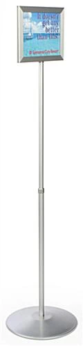 These sign displays are a perfect way to communicate simple, straightforward messages to customers or patrons in restaurants, retail stores, museums, cafeterias and more. Almost all commercial businesses are in need of signage stands at some point in time. Some are used constantly (such as a restaurant displaying a ‘Please Wait To Be Seated’ sign), while others have sign displays to use only when needed (to communicate ‘Wet Floor’ or ‘Performance Sold Out’). These affordable sign displays, also known as sign holders, are crafted from a satin silver finish anodized aluminum and feature a 1″ diameter telescoping pole, so your message can be displayed anywhere between 37″ and 60″ high. The poster holders, sign displays feature a simple, slide-in design; no hardware or force needed to change out your sign.