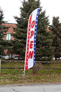14′ Feather Flag & Ground Spike With Pre-printed OPEN Message – Red, White & Blue