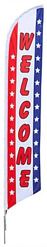 This patriotic feather flag, also called a message banner, is ideal for many businesses or stores. The display sign’s generic phrase of ‘WELCOME’ means this graphic can be used to greet guests practically anywhere, such as outside of a bookstore, clothing shop, department store, stylist, or car dealership! This welcome feather flag that stands 14′ tall is viewable from afar. The image imprinted on the canvas has the color scheme of the American flag with stars and stripes! Each welcome feather flag is constructed with lightweight and affordable polyester. The graphic is dyed through so the reverse image is visible on the reverse side. This patriotic feather flag is always readable, as the curved pole keeps the flag extended. The banner sign is therefore easy to read no matter what the weather conditions.