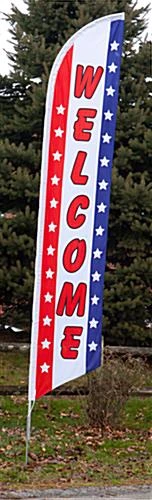 Each welcome feather flag comes with an aluminum pole that is custom made for this display. The banner sign’s aluminum pole is inexpensive when compared to fiberglass poles. The only real difference between fiberglass and aluminum is that fiberglass is a little more durable, but aluminum sells at a fraction of the cost. This patriotic feather flag that is equipped with a durable steel spike is engineered for quick set up on grassy areas. The steel stake can be hammered into the grassy area or other soft ground up to 2′. The welcome feather flag that anchors into the ground with a spike is more stable than banners held in place with a car-foot or cross base. Each banner display can even withstand light to moderate winds! All the user needs for setup is a hammer for the ground spike, everything else is included with this patriotic feather flag.