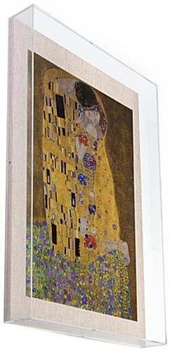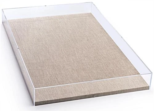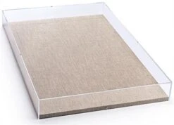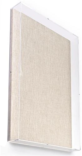 Create a contemporary exhibit with this oversized fabric back wall display frame to properly showcase your artwork. The clean lines of the acrylic cover and linen base provide the ideal backdrop for 20โ x 30โ graphics. Whether at an art exhibit or your own living room, paintings will be presented in classic allure with this contemporary fabric back wall display frame. Mount portrait artwork in your studio or lay sophisticated jewelry on your retail countertop and ensure they are kept intact and properly showcased. The clear cover screws onto the backboard to keep dust and other elements from damaging the graphics hanging inside. Included are 2 screws and hooks that attach to the linen base for hanging paintings underneath the casing. Ensure your images are highlighted properly and securely with this wall display frame.