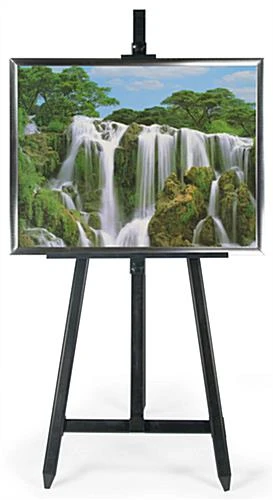 This advertisement display, floor easel is perfect for displaying 22″ x 28″ graphics! The floor easel is constructed from aluminum and features a black finish. The floor easel features (2) adjustable bars to hold displayed materials securely. This floor easel, also known as an art display stand, features (1) silver-finished, aluminum picture frame. The silver frame fits 22″ x 28″ graphics and includes a clear, non-glare lens to prevent graphics from being damaged. This floor easel features a simple, yet attractive design to accentuate any environment. The floor easel stands approximately 64″ tall, reaching most customers’ eye level. This floor easel can be used to advertise poster frames and other material as well, such as bulletin boards, light boxes and dry erase boards. This floor easel features a sleek and contemporary design, making it appealing to the public!