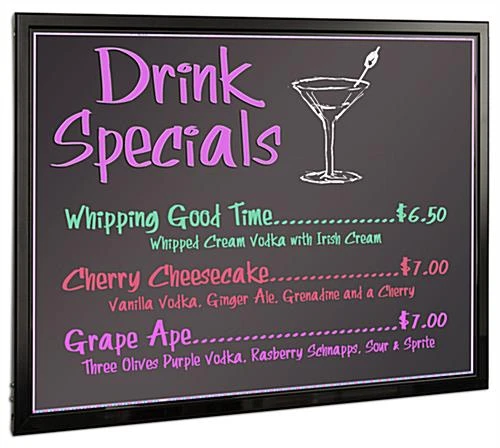 These LED writing boards with seventeen light settings are designed to get your messages noticed, with bright illumination! These write-on signs are great additions to any establishement, as users can easily write their own messages in minutes. These large LED writing boards, also known as menu displays, feature a black markerboard surface with edge-lit lighting technology. The design of these frames features a light channel around the inside edge of the frame, which acts as a border, and have a strip of lights on each of the two longer sides to illuminate messages. These LED writing boards are perfect for writing menu items, displaying specials in a restaurant, or to advertise upcoming events bulletins in retail stores.