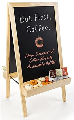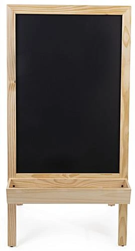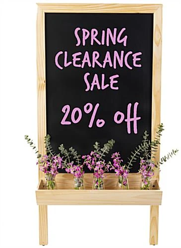 With the double-sided 24โw x 36โh write-on message boards, you will easily attract the attention of passersby walking or driving from either direction. This A-frame chalkboard sidewalk sign serves as the perfect menu board in a commercial or food service environment. The double-sided plant-holders featured at the bottom of the display also serve as the perfect merchandising opportunity when you fill them with your favorite quick sale items. This A-frame menu board is made of sturdy wood with a natural finish, folds up for convenient storage, and can be used either indoors or outdoors. Get creative with your chalkboard sidewalk sign with planter bottom and start grabbing the attention of roadside and pedestrian traffic.