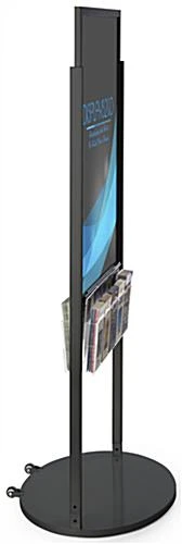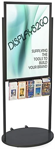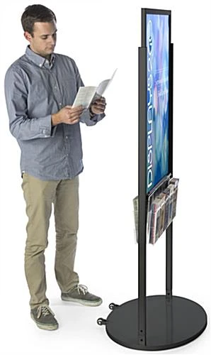 This black 24 x 36 mobile poster display with 10 literature slots for advertisements is a great way to show off your businesses merchandise and services. The sign holder features an acrylic brochure pocket providing an additional way of connecting the content within the advertising graphics with the customer. The moveable poster display has an easy top loading insert in the frame for simple interchanging of your prints. In addition, the panel comes with a heavy duty rolling base thatโs easy to move around your business for better product connectivity. The poster display has a sleek glossy black frame with a modern edge which will fit anywhere within your business setting. Each double-sided panel is perfect for promoting your graphics with a signature sign holder to enhance your customers shopping experience.