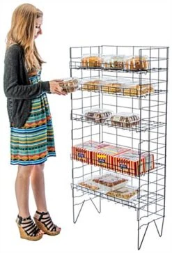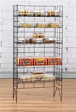 This wire baker’s rack has (5) adjustable shelves to easily accommodate breads, cakes, and pastries of varying sizes. Shops and restaurants can benefit from the kitchen storage stands. Each floor standing baker’s rack features a black glossy finish that looks great in storefronts and is utilitarian enough for everyday use. Five shelves provide plenty of room for baked goods and are adjustable to fit larger cakes and special orders. A baker’s rack is great for pastry shops as well as restaurants looking for additional kitchen storage. Each stand can hold approximately 110 lbs. and is fully collapsible for easy portability.