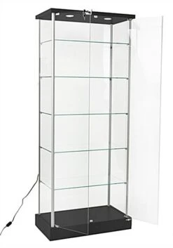 This retail glass display case features (2) recessed LED lights to illuminate a selection of high priced items, such as fine jewelry, artwork, sculptures, and collectibles. Provide convenience for customers viewing products and ease of mind for employees distracted by other tasks with these locking trophy cabinets. Design custom arrangements with more versatility and style than store fixtures like slatwall units with a wide display case. Taller items can be easily positioned within the showcases by modifying or removing one of the five height adjustable shelves. Trophy store fixtures with double locking hinged doors provide easy access to merchandise for employees making a sale. Cabinets with down lighting provide a simple and traditional eye catching display case that is ideal for any boutique, specialty shop, or studio.