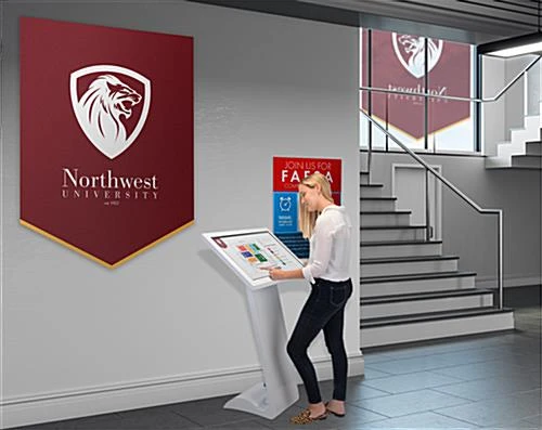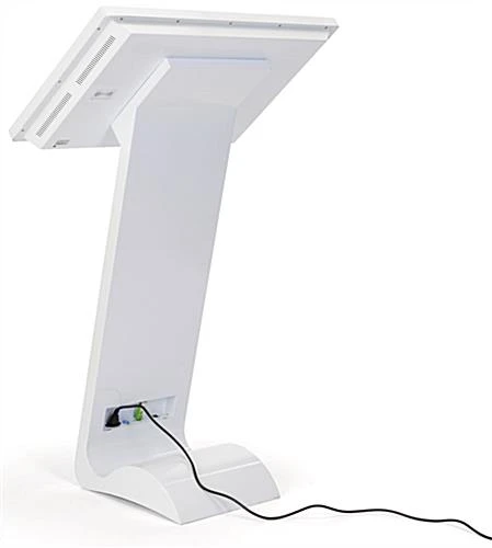 Deliver dynamic messaging with this white touch screen monitor kiosk that features a multi-touch 10pt IR 32” panel and 1080p resolution for sharp images and text. Upload content to this slanted digital signage unit with the plug-n-play design using the available USB port or via a personal cloud storage account over WiFi. This white capacitive touch screen monitor kiosk display offers an interactive solution that promotes customer engagement and is perfect as a wayfinding directory on a campus, menu board in a restaurant, building directory or lobby display. The large scale 32” WLED monitor features a 1400:1 contrast radio, 450-nits brightness, and 89/89 viewing angle. This display unit also features an Android operating system, 2GB of RAM, and 8GB of internal storage for ease of marketing content loading and maintenance. Enhance your multimedia content with this WiFi device that functions with a simple touch of your finger, making it the ideal digital signage advertising fixture. When paired with properly developed content, this touch screen monitor kiosk can provide your establishment with an interactive display to enhance your customers’ experience.