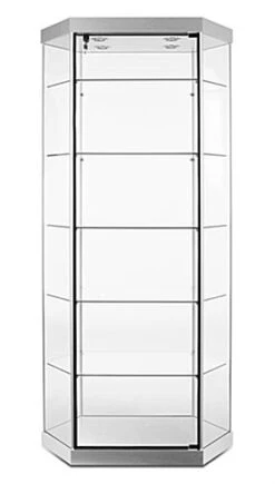 This hexagonal glass display case arrives at your business or home pre-assembled and ready to use! With 4 top recessed LED lights and 7 side track lights, you should have no problem at all highlighting important or valuable items like jewelry, collectibles, museum exhibits, and more! A locking tempered glass door ensure the safety of any item you choose to display on the cabinet’s 5 glass shelves. This glass display case even features hidden wheels in its base to make moving the unit around a lot easier.