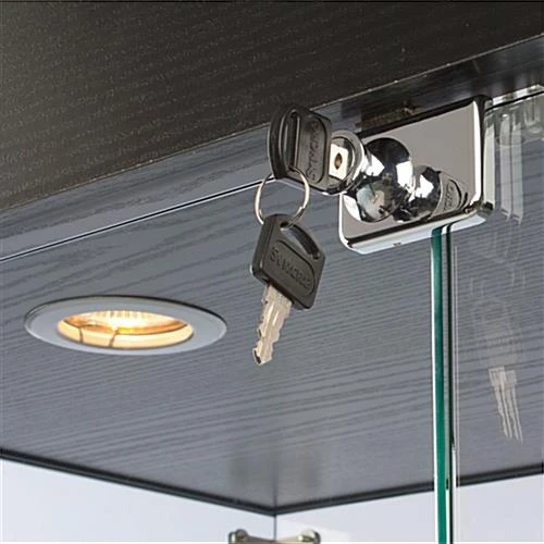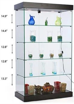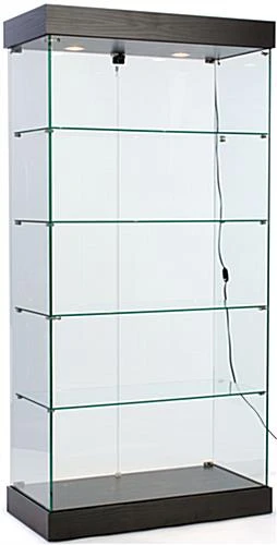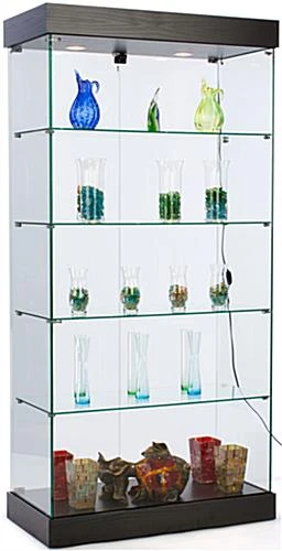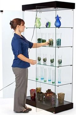 This glass frameless retail cabinet, also known as a showcase tower, belongs to the EuroVū Simplice series. That means that these display cases are engineered and built in Europe. However, this frameless retail cabinet with wheels is stocked here in the United States, so orders ship within 24 hours of purchase. The European design and craftsmanship of these display cases is a welcome alternative to many fixtures seen in today’s stores. The fact this retail cabinet is frameless not only provides an unobstructed view of each shelf. In addition, the design enhances the décor of the establishment using the tower. The frameless retail cabinet that has a black base is ideal for a wide range of establishments, such as a museum, retailer or school. To make these store fixtures more affordable, the base and canopy has an MDF [medium density fiberboard] construction. A black laminate with a wood-grained design gives the base and canopy the look of handcrafted wood. Each frameless retail cabinet has tempered, green-edged glass shelves, doors and walls. is more durable, and much safer for use in public settings than non-treated glass.