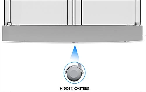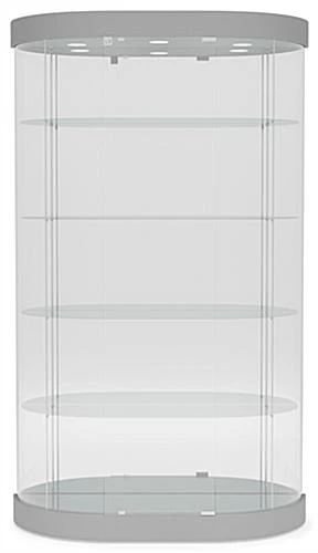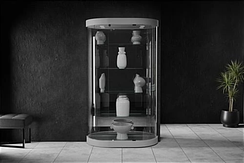 This oval display case has mirrored back panel and frameless tempered glass construction to stage your valued merchandise. Showcase various items of different dimensions by adjusting any of the four tempered glass shelves to your desired height. Four wheels are hidden at the unit’s base for easy transport throughout your storefront. For added security, this oval display case comes equipped with a hinge lock and key set, allowing you to lock away some of your precious items without affecting their visibility. The sleek build and neutral design adds a touch of elegance and sophistication to any retail aesthetic. Equipped with three adjustable top LED lights, you can easily illuminate your goods from the top down to draw the eye to your luxury items. Our oval display case will showcase jewelry, fine china, handbags, and more while elevating any interior space.