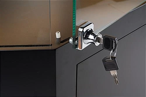 Each corner jewelry showcase with LED lighting has a rear storage area secured with a lock. The narrow door opens to an ample cabinet space, ideal for storing merchandise, gift packaging, or other essential items. This LED-lit jewelry showcase with rear storage features adjustable foot levelers hidden under the display case. This design allows the retail store fixture to be stable on slightly uneven floor surfaces. Each glass jewelry showcase with LED lighting ships assembled for immediate use!