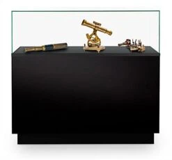 This frameless glass display cabinet features a modern black base made of eco-friendly FSC-certified CollinsWood®. The counter features a 17″ tall break-resistant, tempered glass lift-off top with a keyless air cylinder pneumatic locking system that does not require an electrical outlet. This locking system seals the top onto its base, keeping it tightly secure and locked, perfect for high-end retailers and museums. The stunning showcase is airtight and dust resistant, with silica gel bags in lockable compartments to ensure preservation and protection from moisture. With dimensions of 48″W x 47″H x 20″ D, this luxury fixture is an excellent option for showcasing high-end collectibles and valuable merchandise items in jewelry stores, galleries, or museums. The unit has a beautiful laminate finish, levelers for uneven floor surfaces, and a 4″ toe kick, creating a clean, polished look at its base. This exquisite frameless glass display cabinet is a show-stopping piece that will attract customers to your featured items in any gallery exhibit, showroom, lobby, or retail store.