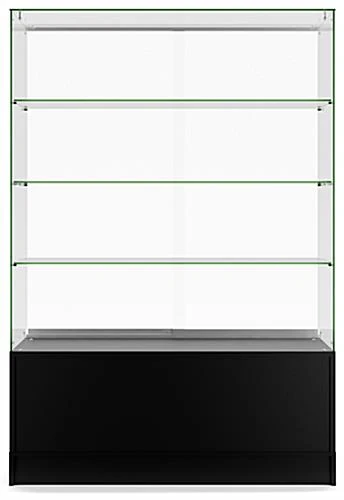 We use shatter-resistant tempered glass in the construction of our display cases, which will break into rounded pieces if an accident does occur. Small metal connectors hold the glass panels and shelving together, removing the chance of obstructing product views. This model features sliding doors with a lock and key system as well as bottom loading storage cabinets. Each glass showcase ships unassembled, saving customers money on shipping cost. Assembly is quick and simple. Typically two adults can unpack, build, and make this display ready for the sales floor in 25 minutes or less.
