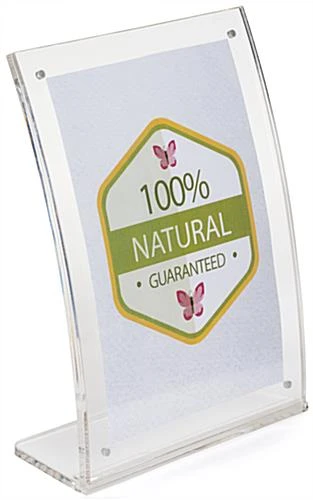 Magnetic closures and a three piece design lend to the sleek design of this 5×7 plastic table frame. Suitable for shops and eateries, the curved clear acrylic faceplates feature polished edges. Each slant back table frame includes a grooved design to connect the base and upright pieces together. Help boost sales with a clear acrylic holder offering signs visibility and ease of use with a removable front panel. Each table frame won’t consume precious display space in your establishment due to the small footprint. Partner a sleek holder with promotional signs in a prime shop location for a powerhouse combination!
