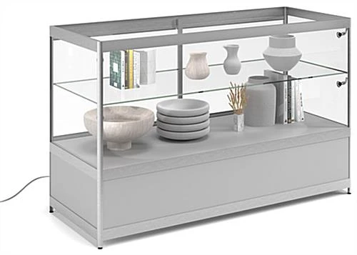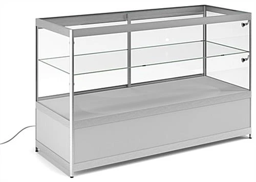 For busy retail shops, this glass store counter with LED lights makes your day-to-day tasks simpler. With its locking doors, these display cases allow you to keep expensive merchandise like jewelry and electronics out on the shelves during business hours. This tempered glass store counter doesnโt sacrifice visibility for security, providing customers with an obstruction-free view of your products. Restock your display cases on the fly by keeping backup inventory in the locking cabinet. Adjust the shelf to fit anything from collectibles to jewelry to trophies and more. Use this glass store counter as a standalone fixture or with other compatible display cases to create a seamless configuration for your retail setup.