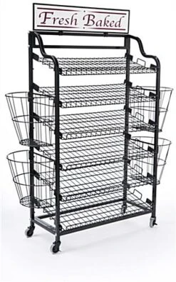 Each bakers stand comes with two sign holders; one with a fixed size steel frame and the other with a coil design that holds many sizes of posters. These bakery displays, also known as retail fixtures, advertise and market merchandise using these optional sign holders. These bakers racks have locking wheels that allow the stand to be transported easily as well as secured in place for use in high traffic stores. These rolling bakery displays can also be moved into kitchens for replenishing baked goods. Each piece of store equipment is made of black powder coated steel and wire. These bakery displays that are made of wire are meant to be durable and long lasting due to the construction.
