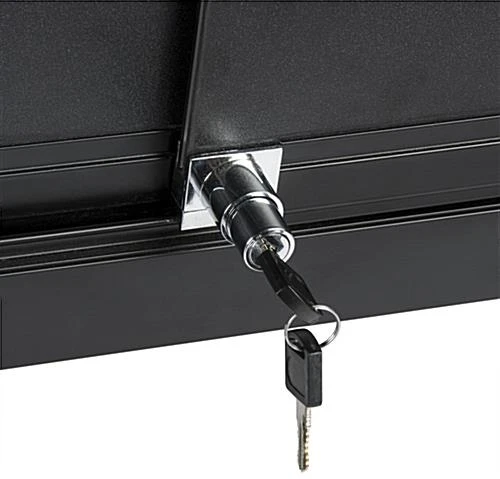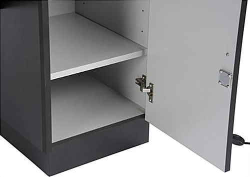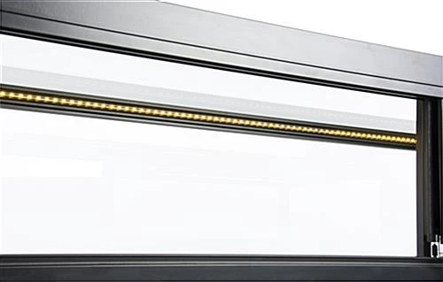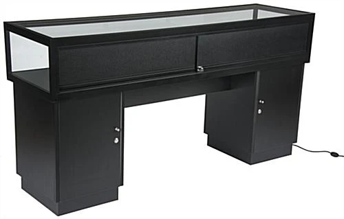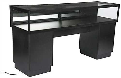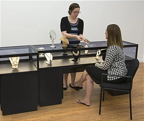 This locking jewelry display case is a perfect addition to your existing store fixtures. With a warm colored LED lighting system, each showcase softly illuminates your products while the tempered glass allows for easy browsing. The counter display case is made with a black aluminum frame and is set on a medium-density fiberboard base that will last through many busy sales days. This showcase also has a cut out for a customer to comfortably sit down and explore your products. Each preassembled unit comes with installed LED ights strips along the interior top, as well as a key to lock both the counter and the two black storage areas for added security of your valuables. This display case, designed to function as a sit down unit, can also be coordinated with other store fixtures for a beautiful, multidimensional showcase for your products.