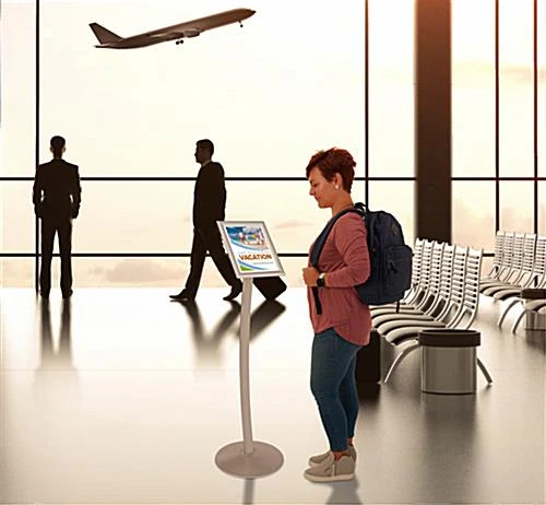 This floor standing sign holder features classic European styling. Display an advertisement, menu or custom printed, standard letter size image in this satin aluminum floorstanding display poster. This floor standing sign, also called a signage holder includes all hardware needed for assembly. One person can quickly, and effortlessly put this unit together.