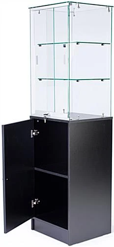 This retail showcase, glass cabinet features a frameless glass design with a black melamine storage cabinet at the bottom. You can showcase your most valuable items at the top while storing additional items below. We manufacture this glass cabinet from that is 6mm in thickness for safety purposes. Tempered glass, when broken, breaks into smaller, more manageable pieces than standard annealed glass. As a result of the frameless construction, items can be viewed from every angle with ease. This display case can be used as part of a configuration to create an entire retail store design or individually, right in the center of your store or museum, showcasing items for all to see.