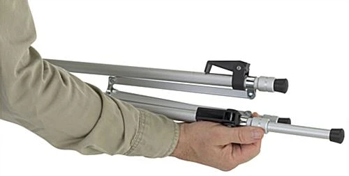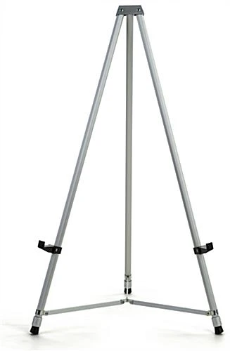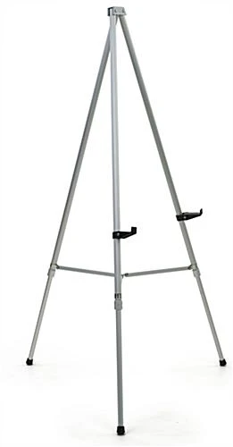This portable silver tripod easel is a great solution to your display needs within any classroom, convention center, waiting room or lobby. The telescoping legs on this aluminum stand conveniently adjust for a range of floor standing and countertop heights, ensuring size compatibility within your unique environment. Prop up important customer information on a reception desk, or display your full sized logo at a large trade show. This versatile silver tripod easel also has two support arms that can be repositioned for various media sizes, so you can tailor the fixture to your existing signage. The knockdown design eliminates the need for any tools, while the durable aluminum is lightweight for easy travel. Simply lift the center to collapse the three telescoping legs upon transport or storage. The rubber feet allow for easy repositioning even after assembly by protecting surfaces from scuffs. This lightweight silver tripod easel with both floor standing and countertop heights will allow your displays to make a strong impact with customers in any environment!