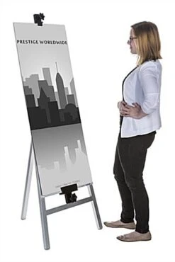 This silver folding metal easel is as reliable as it is functional. Made with a heavy duty aluminum material, it is remarkably sturdy and can hold heavier display items. Use this floor standing easel with adjustable knobs to perfectly hold your poster, canvas or upcoming presentation firmly in place. Non-skid feet offer added sturdiness and security, while also protecting surfaces from its aluminum frame. Though this display easel is suitable for presentation purposes, its heavy duty material is durable and strong enough to be used in a studio for drawing or painting. The adjustable canvas holders can accommodate media up to 47.25” tall. With its tripod design, this stand can fold flat for easy storage and transport.