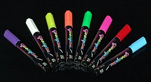 The fluorescent pen writes smoothly and dries quickly on any non-porous surfaces. These neon bright sticks, colorful chalk ink markers are made from high concentration fluorescent powder. Messages written on the board using these wet-erase sticks also can be erased with any damp or wet cloth. Therefore, for businesses that frequently change their menu items, these chalk ink markers that clean off easily will be an ideal writing instrument. Neon bright sticks, like the one seen here, are nothing like traditional chalk which often leaves dust or ghosting. These liquid fluorescent pens, chalk ink markers can be used on windows, glass, plastic and glossy blackboards. For better results and greater effect, customers can also use these chalk ink markers on a flashing LED light box to make the message glows in the dark. Add excitement, emphasis and color to your message board with these liquid neon pens. Businesses can create an impressive message board that gets noticed with these fluorescent bright sticks. Buy these liquid neon pens today and see the differences yourself!