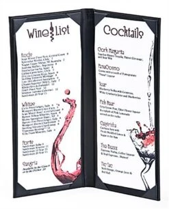The synthetic leatherette material of these holders provides the appearance of authentic leather at a fraction of the cost. Each of these wine list covers that are black will match the decor of any restaurant. The slimmer design of this menu covering is ideal for drink specials. These wine list covers that are sturdy can stand alone on tables and countertops to catch the eye of patrons. The slim design of these drink menu is ideal for display on bar tops as well. These black wine list covers hold (2) custom printed menu cards. Easily reprint new menus as restaurant selections change, with this convenient paper size. These wine list covers that are 4-1/4″ x 11″ will improve drink sales within any dining facility!
