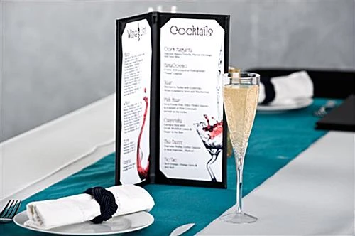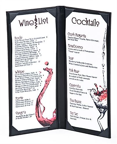 These upscale wine list covers, known as menu holders, are great for use within all dining establishments. Displays lists in style with these selection holders. Wine list covers are heavier than standard restaurant menus, which provides an upscale feel. A matte black finish is sure to match any decor. The restaurant wine list covers include photo album corners to hold menus in place. This design is ideal for locations needing to change food listings frequently, as waitstaff can quickly and easily change out printed menus in mere seconds! These wine list covers are sturdy enough to holder thicker sheets, unlike other flimsy covering styles.