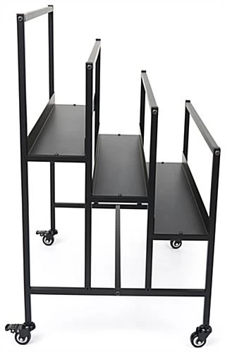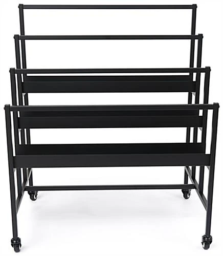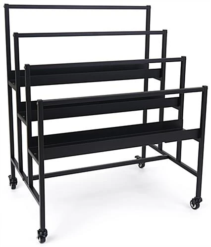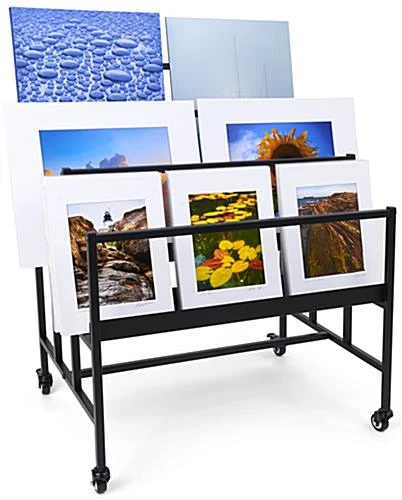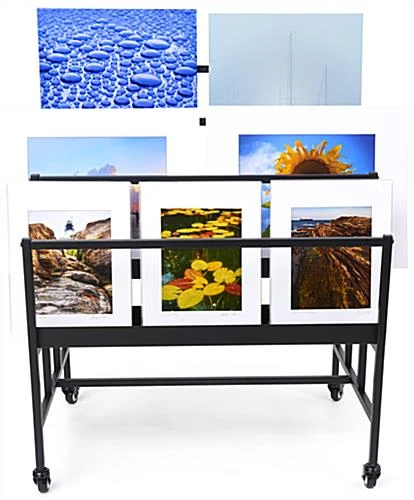This three-tier art display rack has a contemporary steel construction that is excellent for showcasing photography, paintings, drawings, and more at gift shops, galleries, fairs, and festivals. The sleek black stand features four durable casters, with two that can lock in place and quickly unlock for easy movement and transportation. Our rolling three-tier art display rack can hold up to (75) 24″ x 36″ print protectors, perfect for preserving your photography during any event. This storage holder includes all necessary hardware and tools to assemble within minutes. The multi-level rolling fixture is a great way to keep your artwork organized and free from damage by neatly arranging the prints in the unit’s dividers. Use this durable steel three-tier art display rack in high-traffic areas such as gift shops, craft fairs, museums, and more.