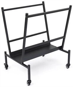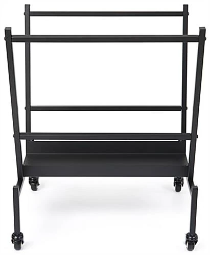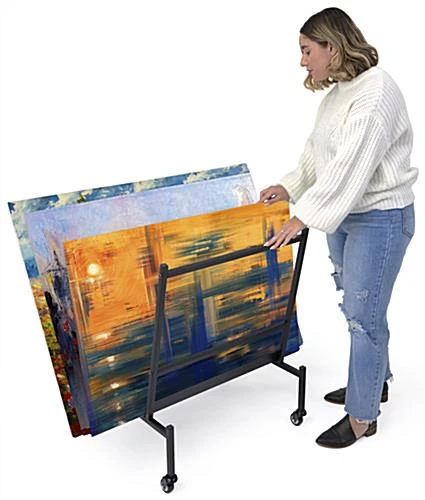 This print storage rack can hold up to (50) 24″ x 36″ art protectors, perfect for showcasing a variety of artwork at museum shops, galleries, fairs, and festivals. The heavy-duty construction and black powder-coated finish ensure it will last through years of use. This steel mobile print storage rack for art includes two durable locking casters, ideal while displaying your work in high traffic areas. The single bin is an excellent way to remain organized and professional while making artwork more accessible. Our sleek black stand includes all necessary hardware and tools to assemble within minutes. Use this mobile steel print storage rack with locking casters to not only keep photography and paintings crease-free but to draw the attention of customers passing by during markets and fairs.