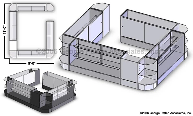 Economy Modular display cases are retail fixtures that give flexibility to a center aisle mall vendor or a large department store. The configuration shown above is relatively compact, yet allows a retailer to display a large quantity of merchandise. This set of modular display cases includes a single register stand, four corners, and four 72″w showcases. Please note: Our Economy series are manufactured with a low-pressure laminate, called melamine. This is a lesser grade of laminate than Formica™ type laminates used on kitchen counters and is more susceptible to knicks, dings and scratches than our deluxe series.