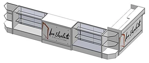 This white cash wrap setup with graphics includes: (2) 4’ full vision counters, (2) corner units, (1) 48” checkout stand, & (1) 72” cashier station. Design a unique and specially made configuration by purchasing custom UV printed panels engineered to affix to the front of the units. Printing text, logos, and art on the clear acrylic allows versatility and complete design freedom for a (6) piece cash wrap set up ideal for any retail environment. Custom images are printed onto the panels which are then affixed to the front of the display cases with silver standoffs. Installation of each panel is quick and easy: secure attachments to the front of the showcases, screw the barrel to the flange, place the displays on to the mount, and tighten the compatible top cap.