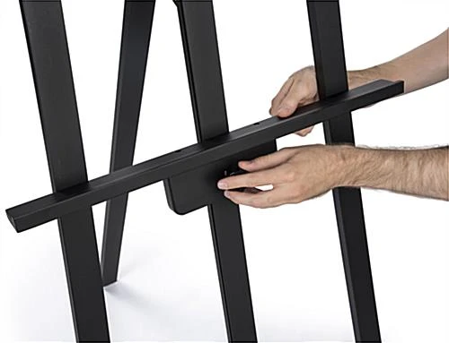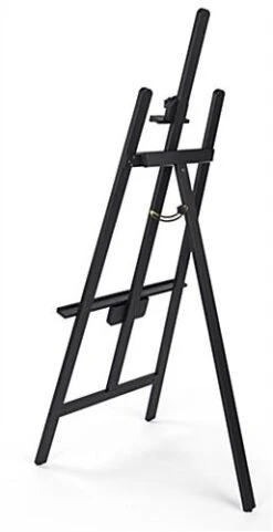 Drawing easel, such as this wooden a-frame holder, is a fundamental tool in any collection of art supplies. This stand measures 23-5/8″w x 65″h and weigh only 7.5 lbs., enabling an artist to move and transport these large, lightweight artwork holders easily. This drawing easel is a studio easel that store flat and can be assembled quickly. A Phillips-Head screwdriver and all necessary hardware parts are included with these artwork display racks, which helps to expedite the assembly process. One person can easily assemble these studio easels in a matter of minutes.