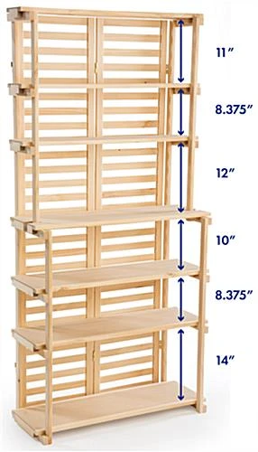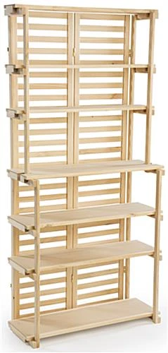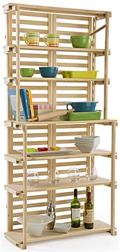 This wooden bakers rack has (6) shelves for holding a huge variety of shop merchandise or home goods. Four deep bottom ledges provide more than enough room for boxes, books, blankets, dishes, antiques, collectibles or more! This rustic bakers rack is perfect for a consignment shop, general store, furniture store, farmers market, or liquor outlet. Pile the natural finish shelves with crafts, produce, wine bottles or plants! Made of pine wood and particle board, this bakers rack can be stained or painted to match any décor. For added convenience, this natural finish retail furniture unit is very quick and easy to assemble, requiring no tools or hardware!