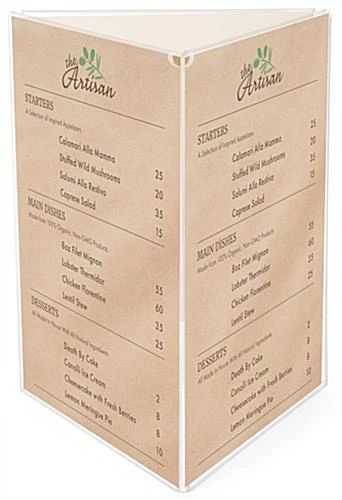 This menu display, multi-sided sign holder, can also be used in a lobby to post informational messages for visitors. The convenient 8.5″ x 11″ size makes it easy to create signage straight from a standard office printer. Place this menu display that is three-sided near a cash register or carry-out area to advertise current specials. The extra large size, and tri-fold design is sure to capture the attention of guests and customers. This menu display is easy to change out signs in a very quick and orderly fashion. The bottom of each panel is open, allowing signage to slide out. This menu display, also called a table tent, is offered in several other sizes in this online collection.